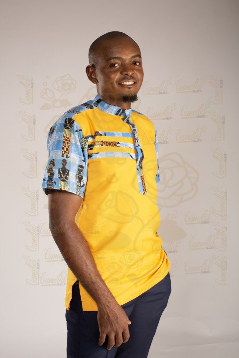 Jeune homme teint claire veste jaune design afrique beau sourire