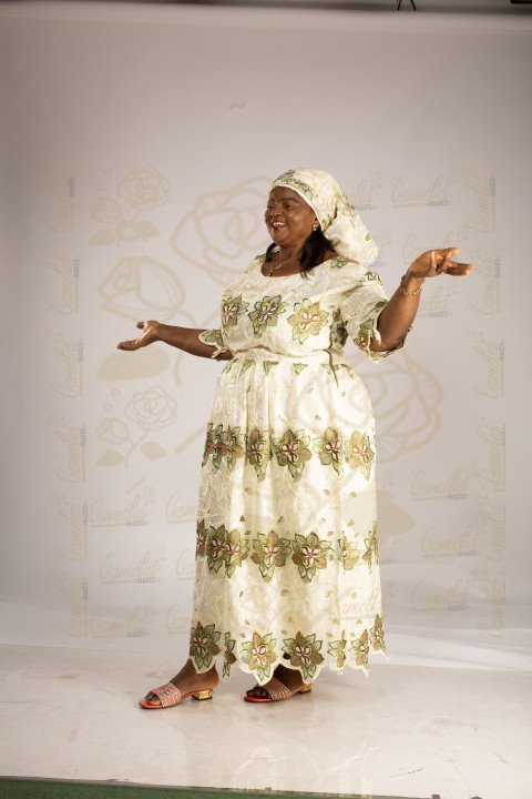 Femme Maman africaine grand sourire gestuel foulard ensemble pagne