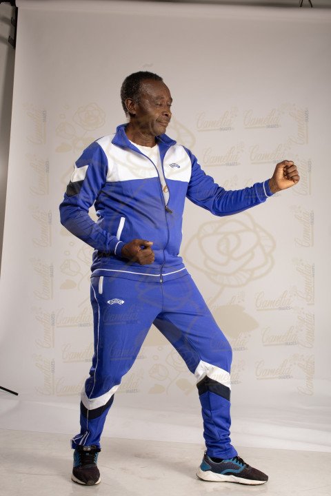 Homme mature ensemble sport bleu blanc tennis noire art martiaux