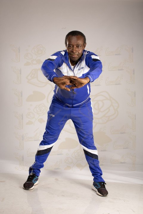 Homme africain exercices sportif polo rouge pantalon jeans bleu chaussures all-stars