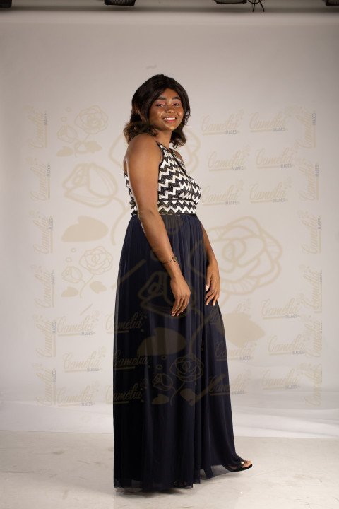 Jeune femme africaine cheveux au vent min robe noire posture gestuel main reins