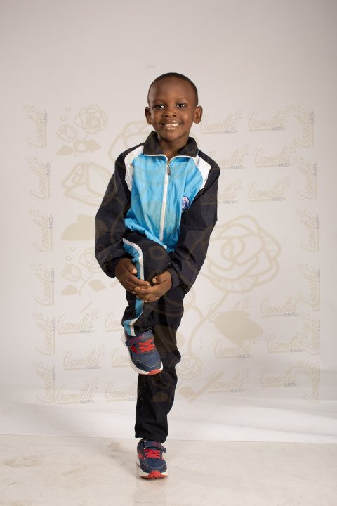 Jeune petit garçon africain tenue sport expression visage dent grand saut