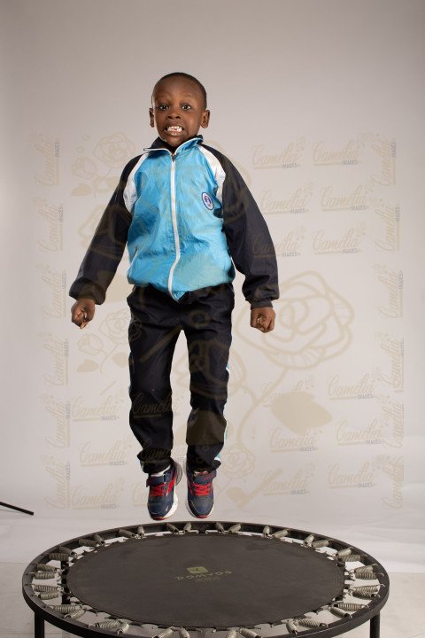 Jeune petit garçon africain tenue sport expression visage grimasse saut