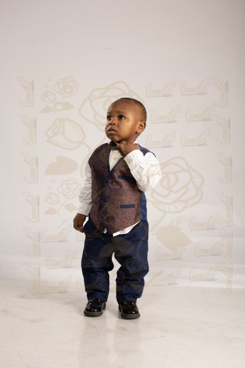 Petit enfant africain élégant jacket chemise blanche pantalon bleu paire noire