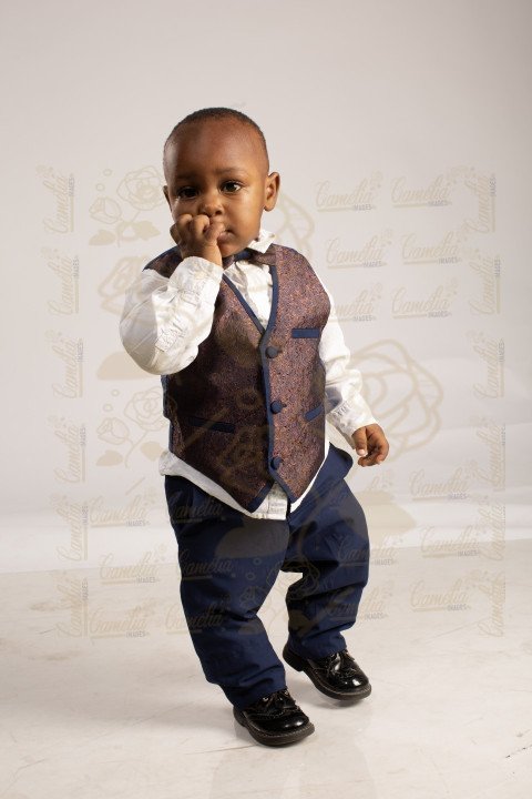Petit enfant africain élégant jacket chemise blanche pantalon bleu paire noire