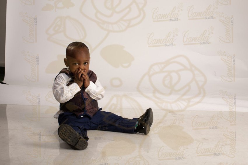 Petit enfant africain élégant jacket chemise blanche assis sol mains bouche