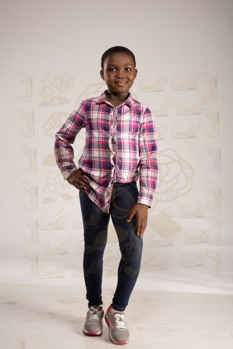 Jeune petite fille teint chocolat chemise carrelé pantalon jeans tennis grise