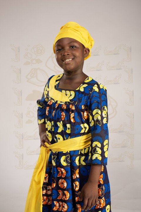 Portrait Jeune petite fille africaine foulard jaune cabas ceinture jolie sourire