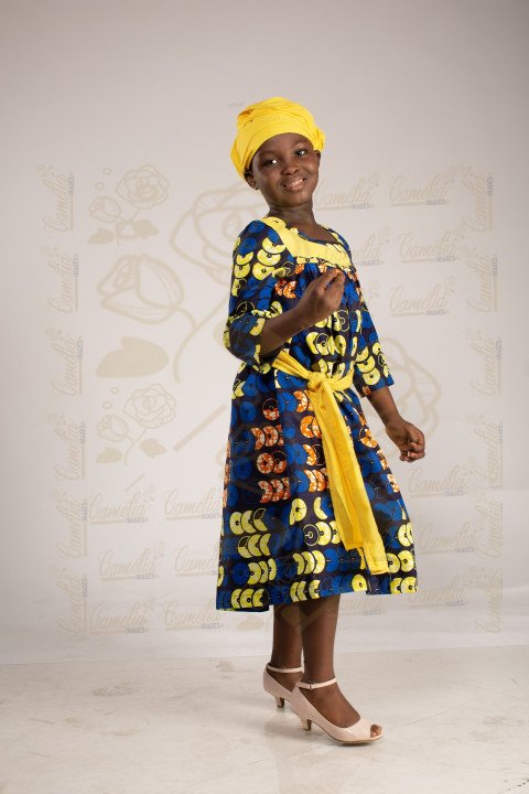 Jeune petite fille africaine foulard jaune cabas ceinture talon rose talon