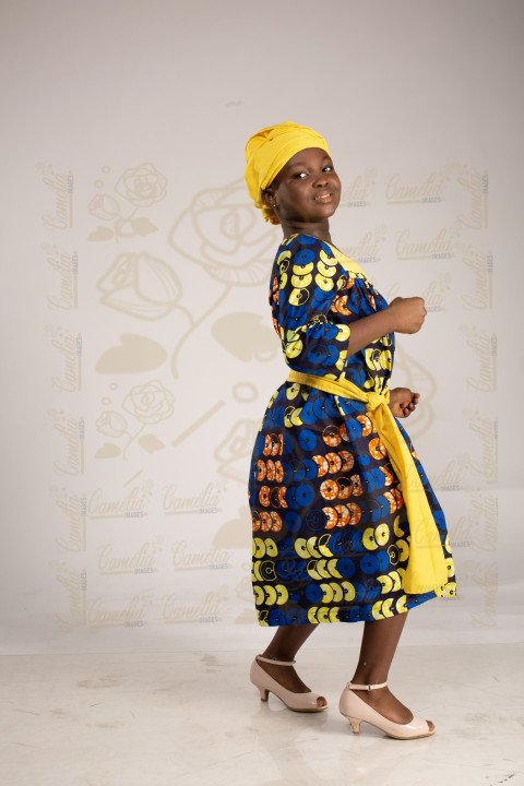 Jeune petite fille africaine foulard jaune cabas ceinture talon rose gestuel