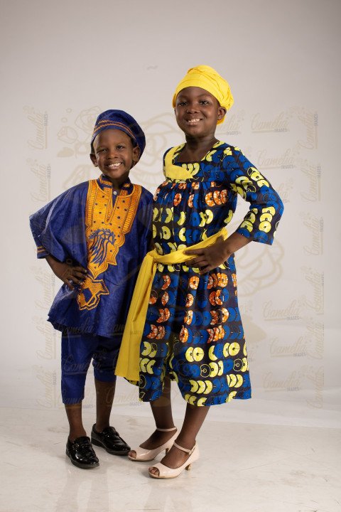 Jeune petite fille petit frère ensemble Gand bleu africain foulard jaune