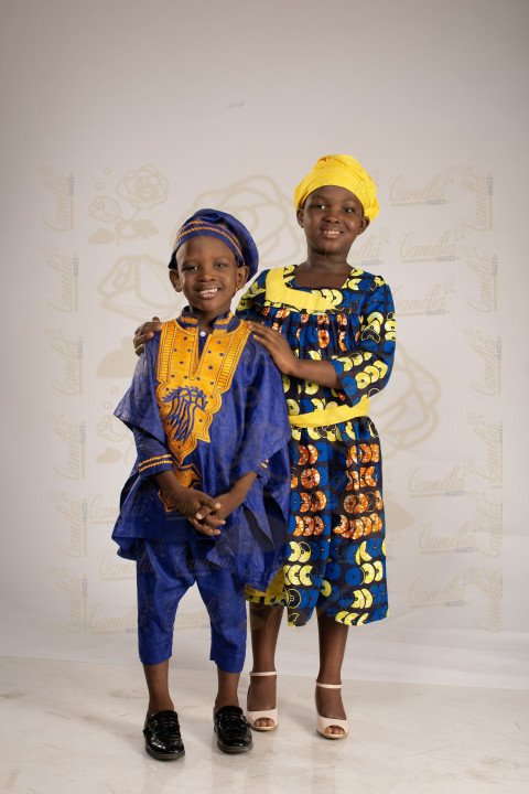 Jeune petite fille petit frère ensemble Gand bleu africain foulard jaune mains epaules