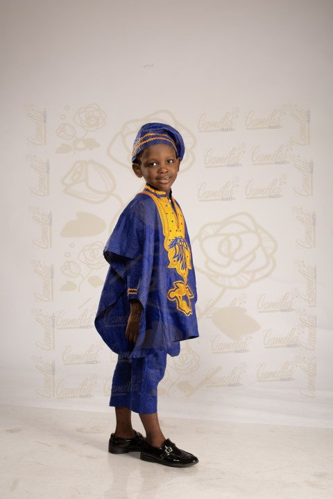 Petit enfant africain élégant jacket chemise blanche pantalon bleu paire noire