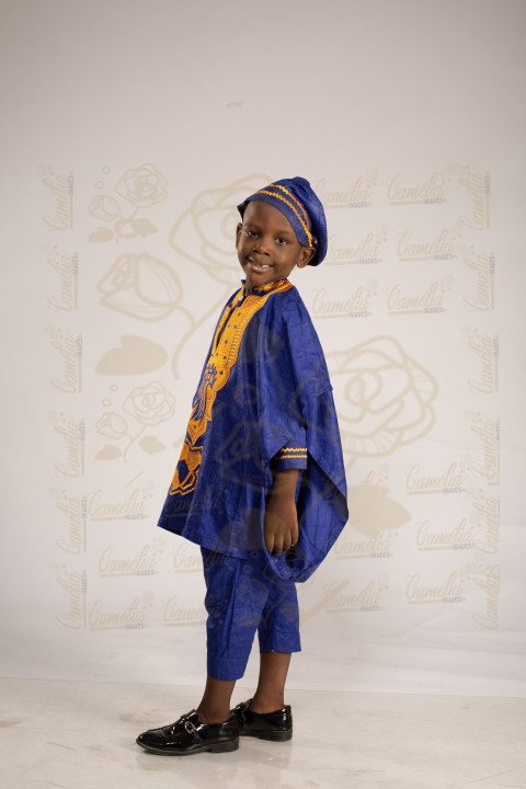 Petit enfant africain élégant jacket chemise blanche pantalon bleu paire noire
