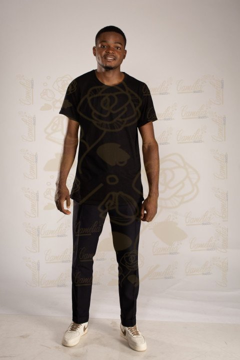 Jeune homme africain t-shirt noir pantalon noire chaussure noire