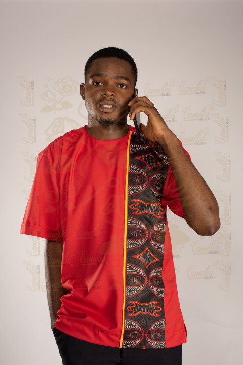Jeune Africain en veste rouge design afritude manipule téléphone