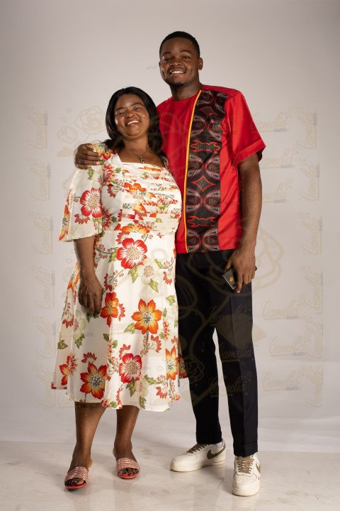 Maman africaine belle claire robe fleurs fils grand taille veste bordeau tennis blanche