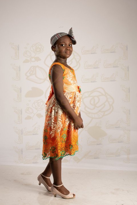 Petite fille africaine belle tenue fleurs orange talon gestuel vu profil