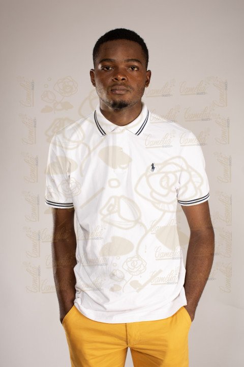 Portrait Bel homme africain polo blanc culotte jaune teint claire