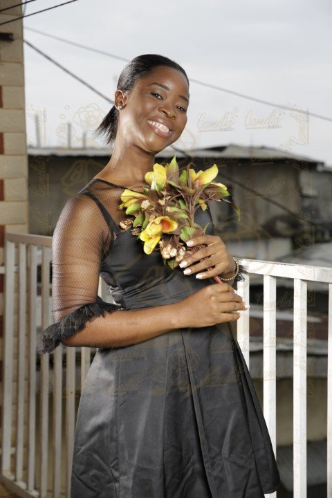 Femme africaine cheveux noire bouquet fleurs jaune vert rose grand sourire