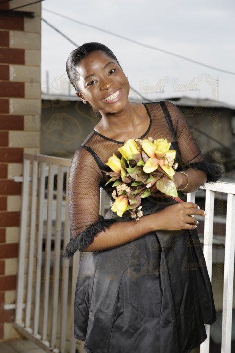 Femme africaine cheveux noire bouquet fleurs jaune vert rose gestuel grand sourire