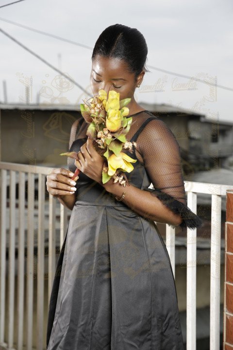 Femme africaine cheveux noire bouquet fleurs jaune vert rose