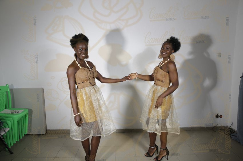 Couple Africain homme en veste et femme en robe boujoux colliers sourire