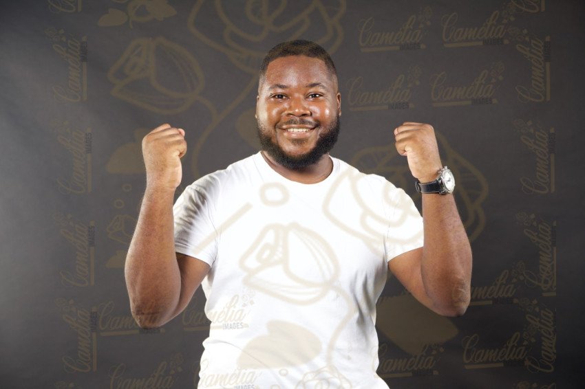 Portrait homme africain sourire barbe noire gestuel victoire montre poigné