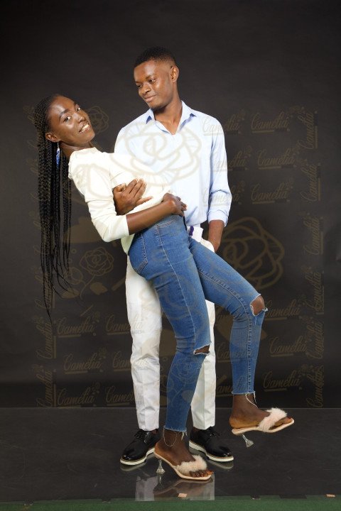 Jeune homme africain teint claire tient femme teint chocolat boucle oreille pantalon destroy
