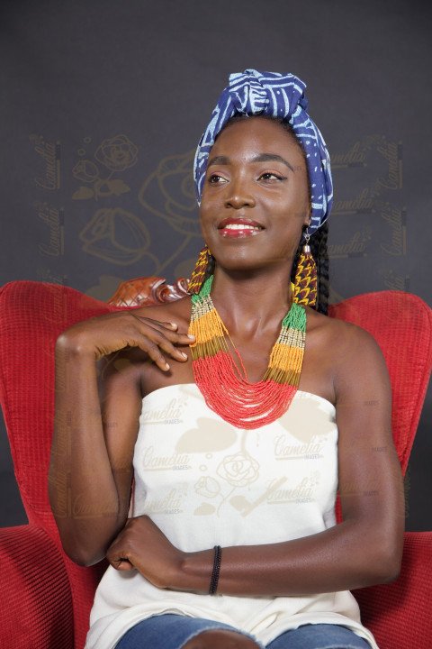Jeune femme beauté africaine jolie sourire rouge a lèvre foulard boucles colliers afritude