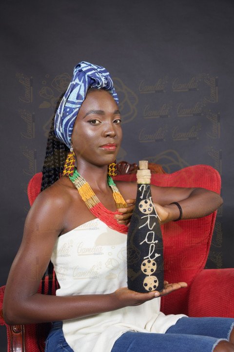 Jeune femme beauté africaine boucles colliers afritude bouteille décoration artisanal