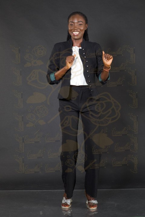 Femme affaire africaine veste noire gestuel expression visage grand sourire