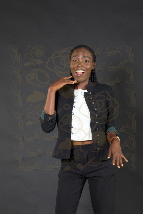 Jeune femme africaine veste noire t-shirt blanc jolie sourire bras croisés