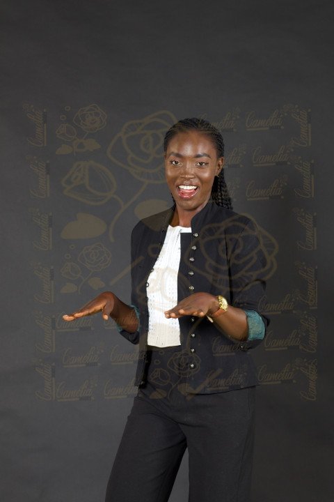 Femme affaire africaine veste noire gestuel expression visage grimasse bouche