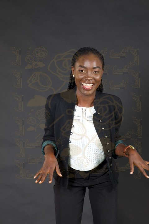 Femme affaire africaine veste noire gestuel expression visage grand sourire