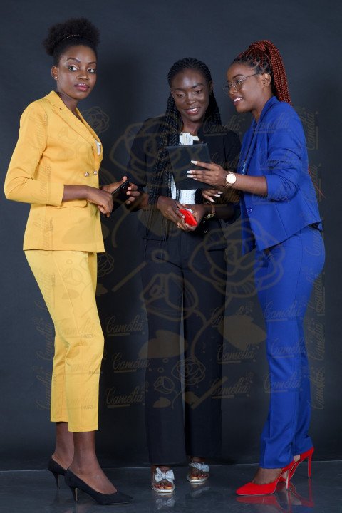 Trois femmes africaine coiffure rasta afro veste jaune noire et bleu grand sourire