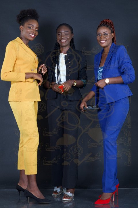 Trois femmes africaine yeux fermés coiffure rasta afro veste jaune noire et bleu