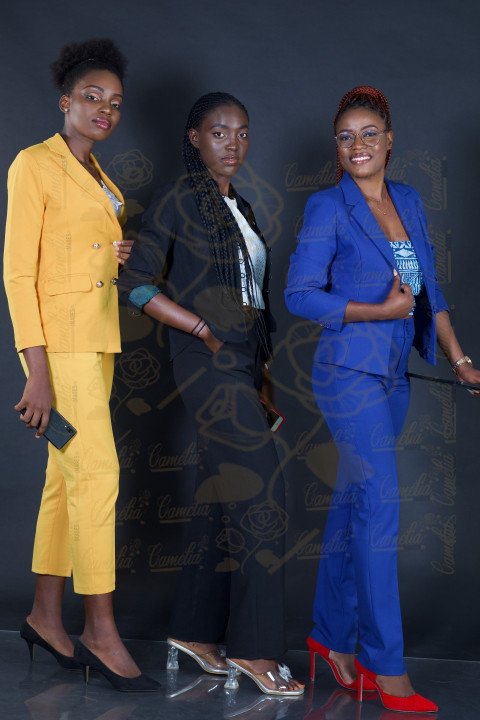 Trois femmes africaine yeux fermés coiffure rasta afro veste jaune noire et bleu