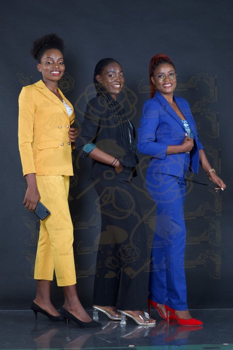 Trois femmes africaine jolie sourire coiffure rasta afro veste jaune noire et bleu