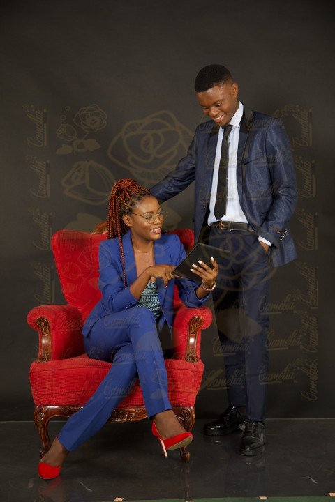 Jeune homme africain en costume violet cravate et femme en veste bleu talon rouge
