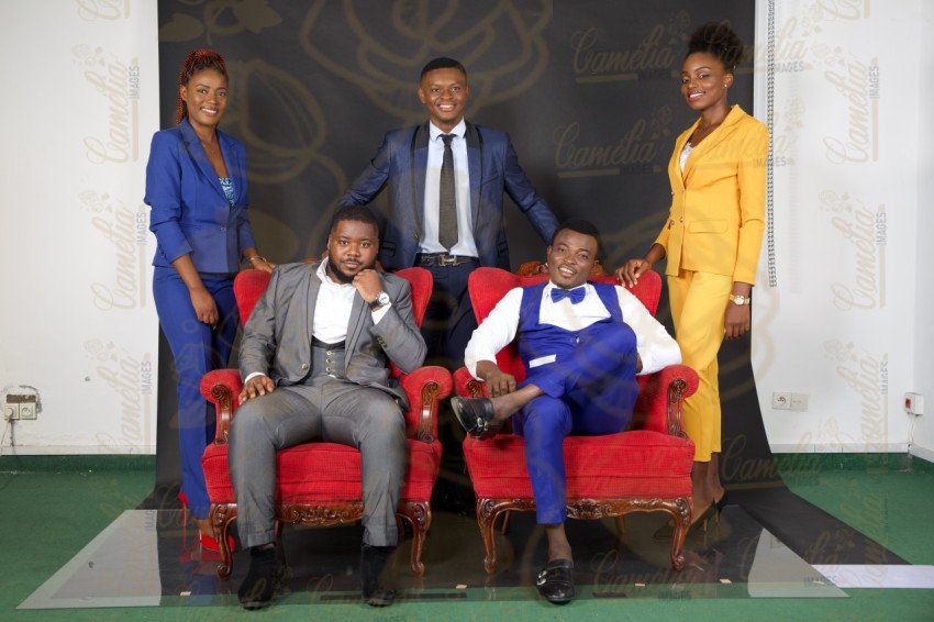 Groupes Hommes et femmes africaines costumes grand sourire assis fauteuil