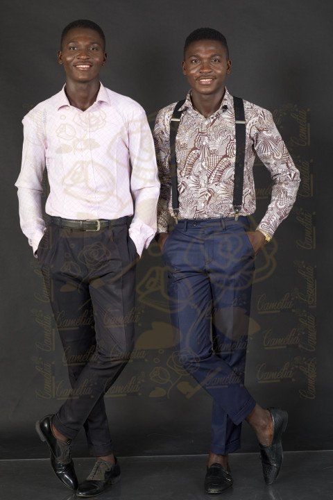 Frères Jumeaux africain teint noir pantalon super cent chemise fleurit paire noire