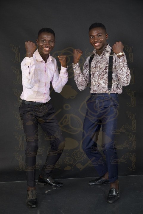 Frères Jumeaux africain teint noir pantalon super cent chemise fleurit gestuel doigts