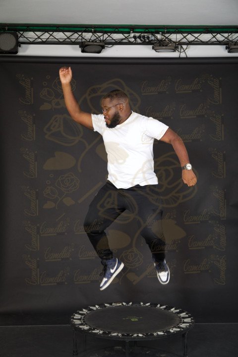Homme décontracté t-shirt blanc panton noir tenis nike gestuel bras saut sport