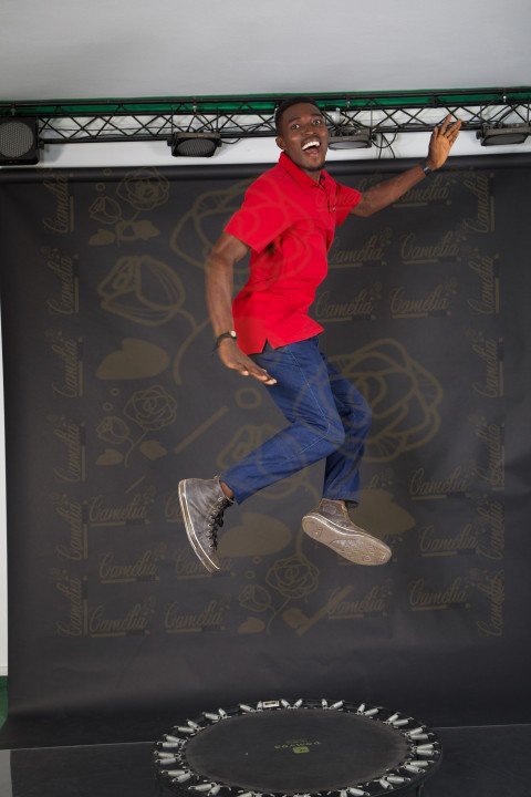 Homme africain exercices sportif polo rouge pantalon jeans bleu chaussures all-stars