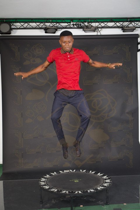 Jeune petit garçon africain tenue sport expression visage dent grand saut