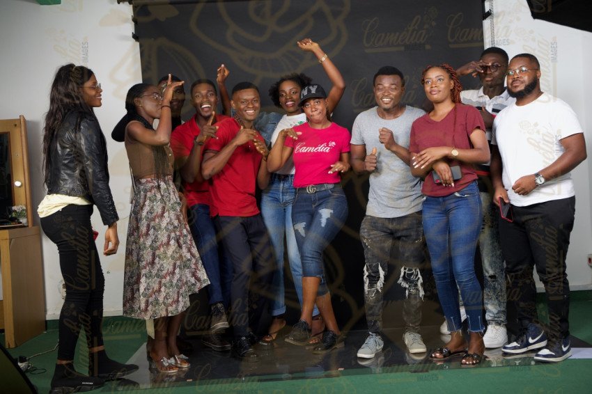 Photo d'ensemble hommes et femmes decontractés grimasse gestuel joie et sourire
