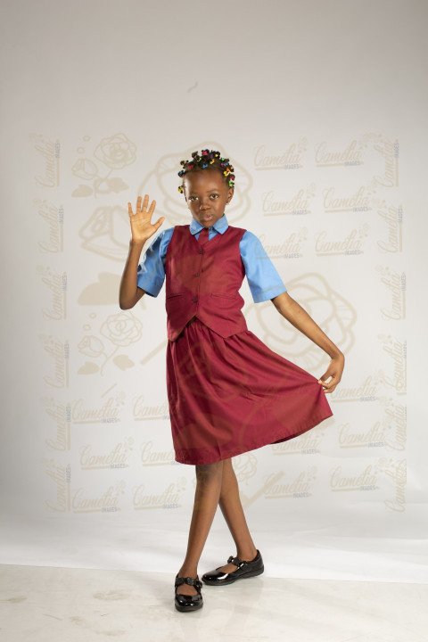 Jeune petite fille africaine belle grand sourire tenue classe chaussures noires coiffure matoba
