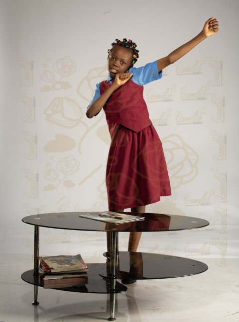 Petite écolière jolie sourire teint chocolat chemise bleu jacket bordeau gestuel