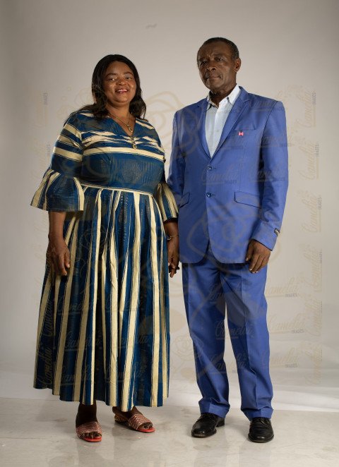 Couple Africain homme en veste et femme en robe boujoux colliers sourire